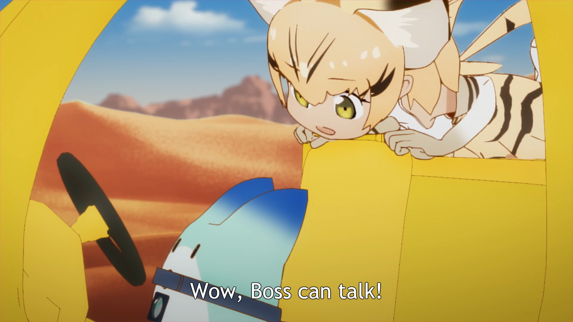 Description: A cartoon character is laying down on a yellow object with a caption that reads wow boss can talk.