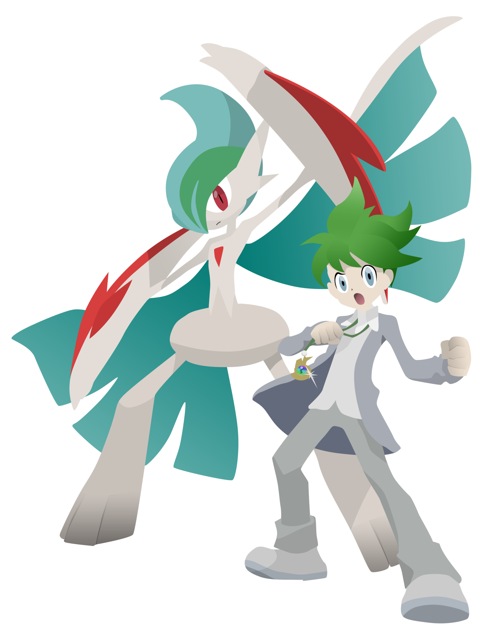 Description: A couple of cartoon characters standing next to each other on a black background with a red and green object.