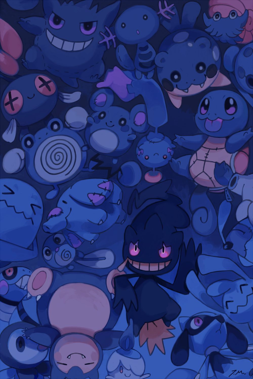 Description: A bunch of cartoon characters are grouped together in a pile of blue ones.