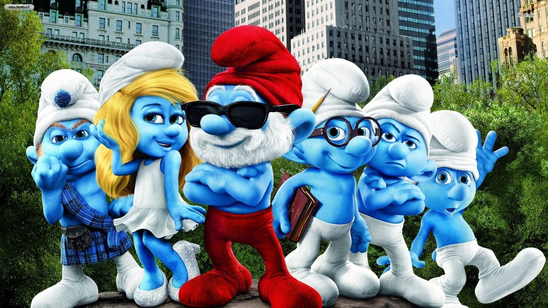 Description: A group of cartoon characters standing in front of a cityscape with buildings in the background and a smurf in the foreground.