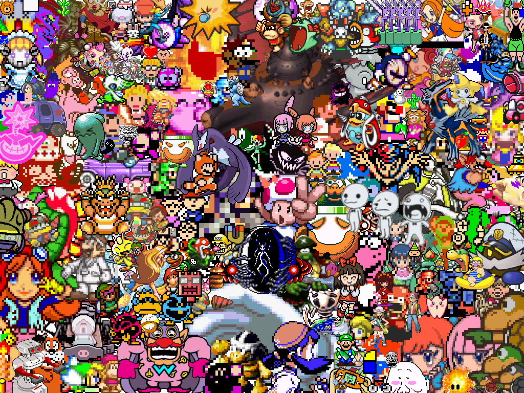 Description: A large amount of different colored and cartoon characters on a wallpaper background with a large amount of different colored and cartoon characters on the wallpaper.