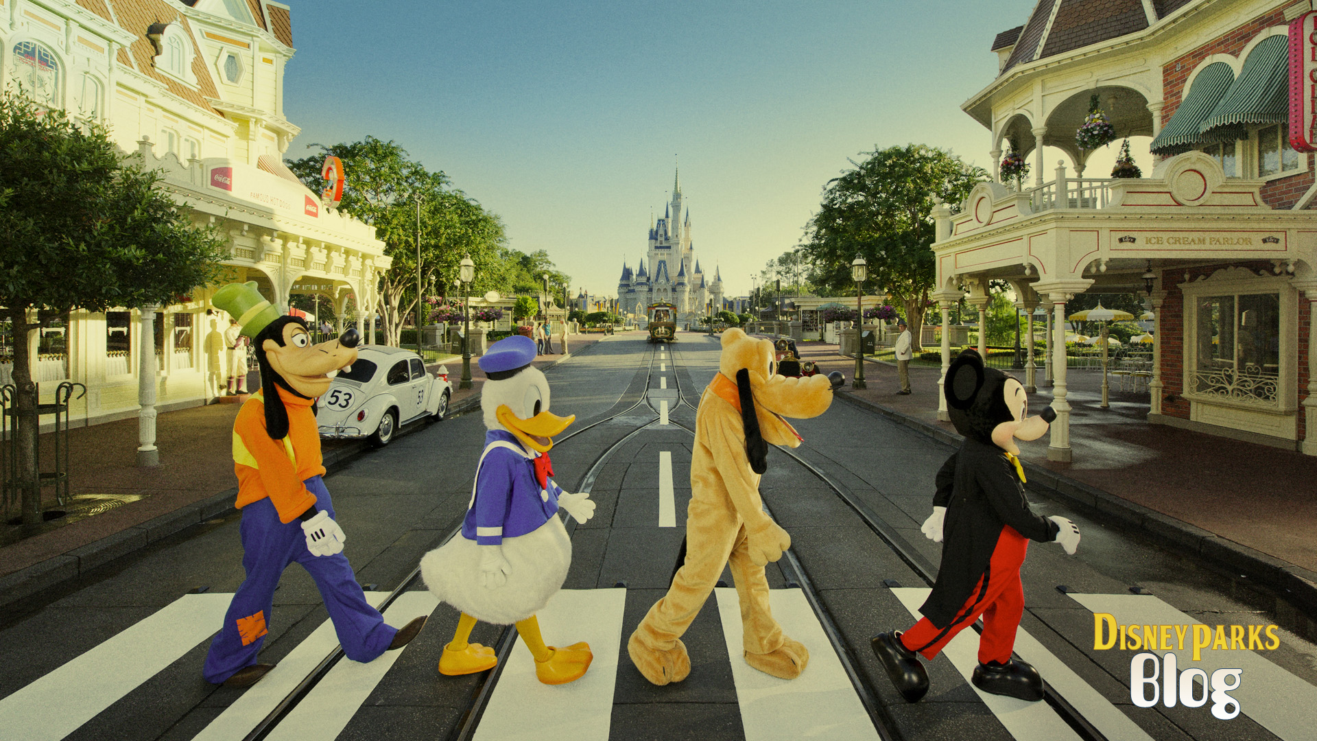 Description: A group of cartoon characters crossing a street in front of a castle and a street sign with a disney world in the background.