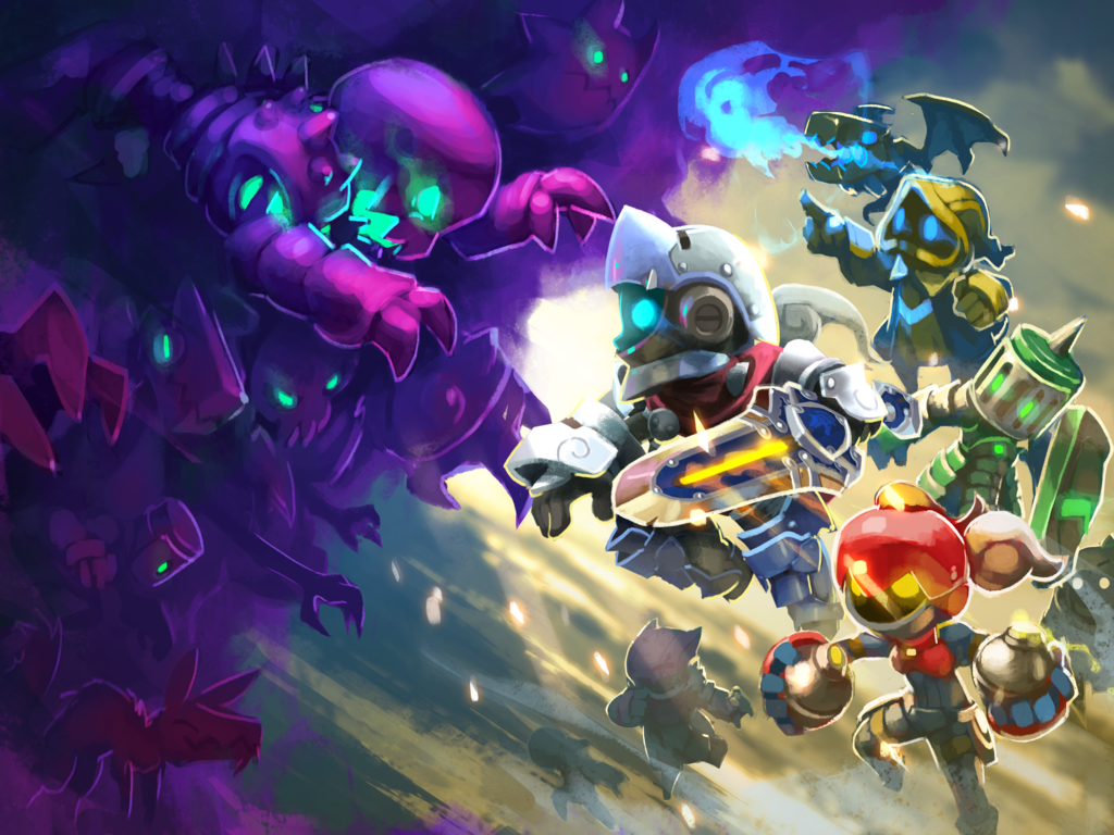 Description: A bunch of cartoon characters in a game with a purple background and a purple background with a yellow and blue character.