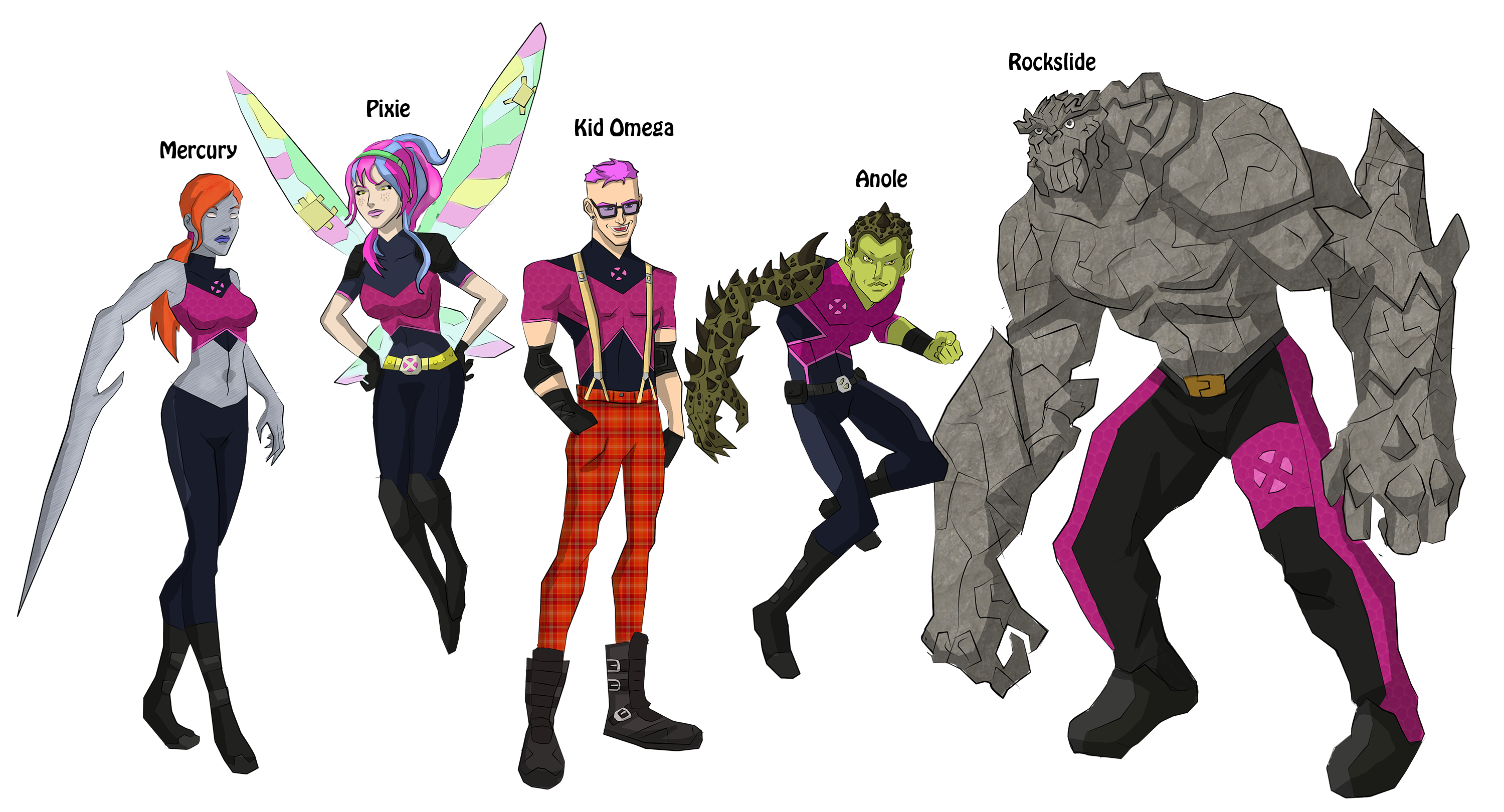 Description: A group of cartoon characters standing next to each other in front of a white background with a black background.