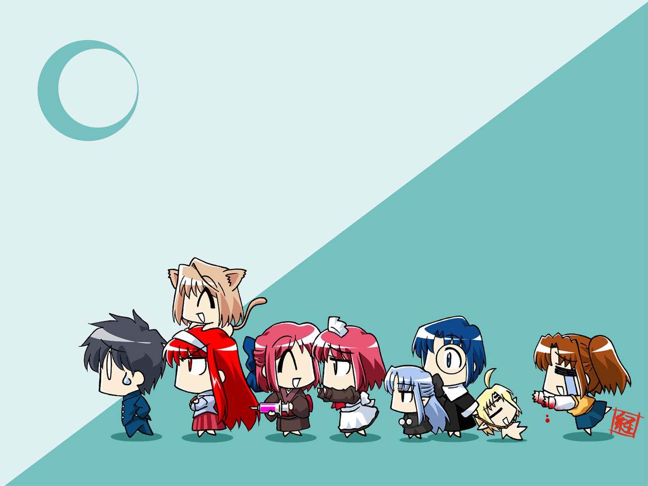 Description: A group of cartoon characters standing in a line with a half moon in the background and a half moon in the background.