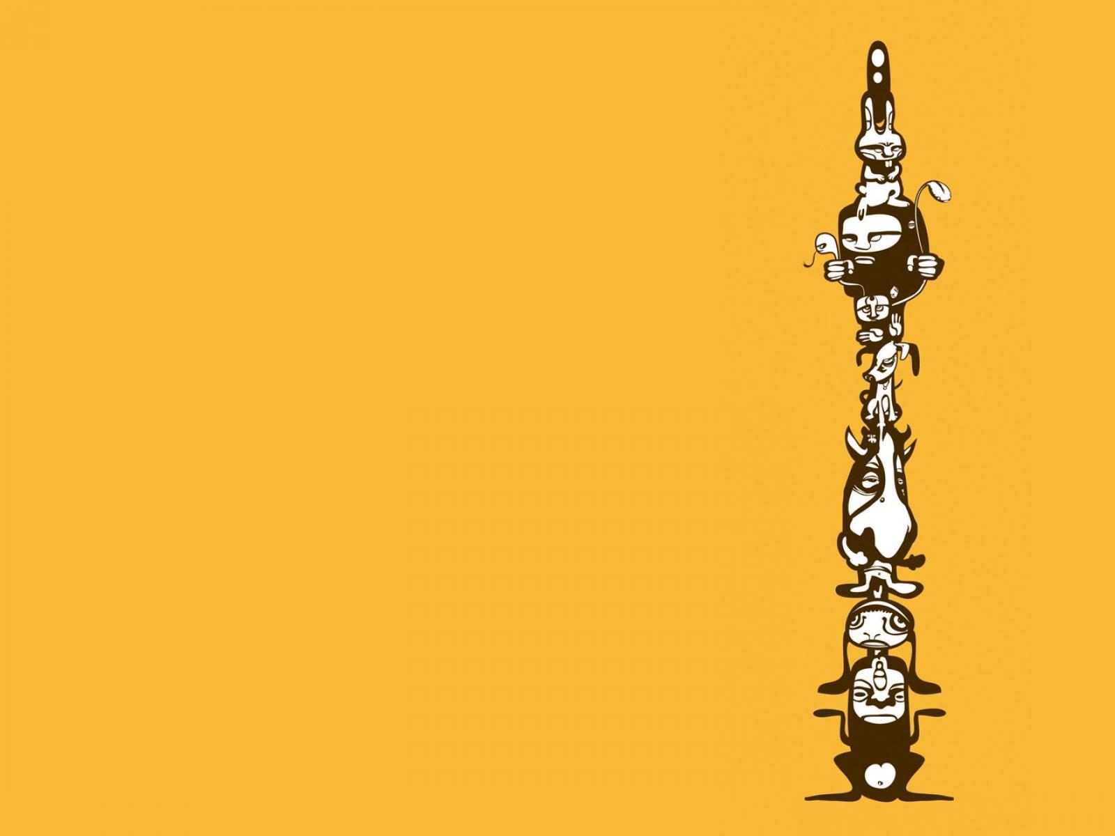 Description: A group of cartoon characters standing on top of a tall pole with a yellow background and a black and white line of characters.