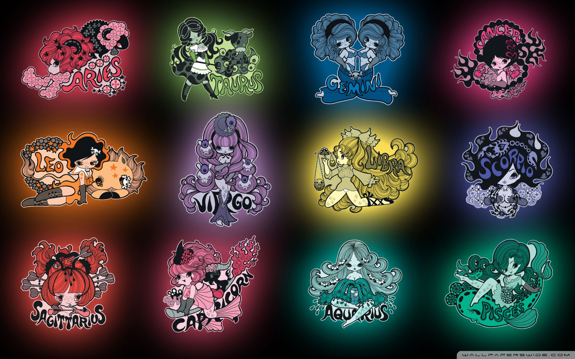 Description: A bunch of cartoon characters on a black background with a rainbow background and a black background with a black background.