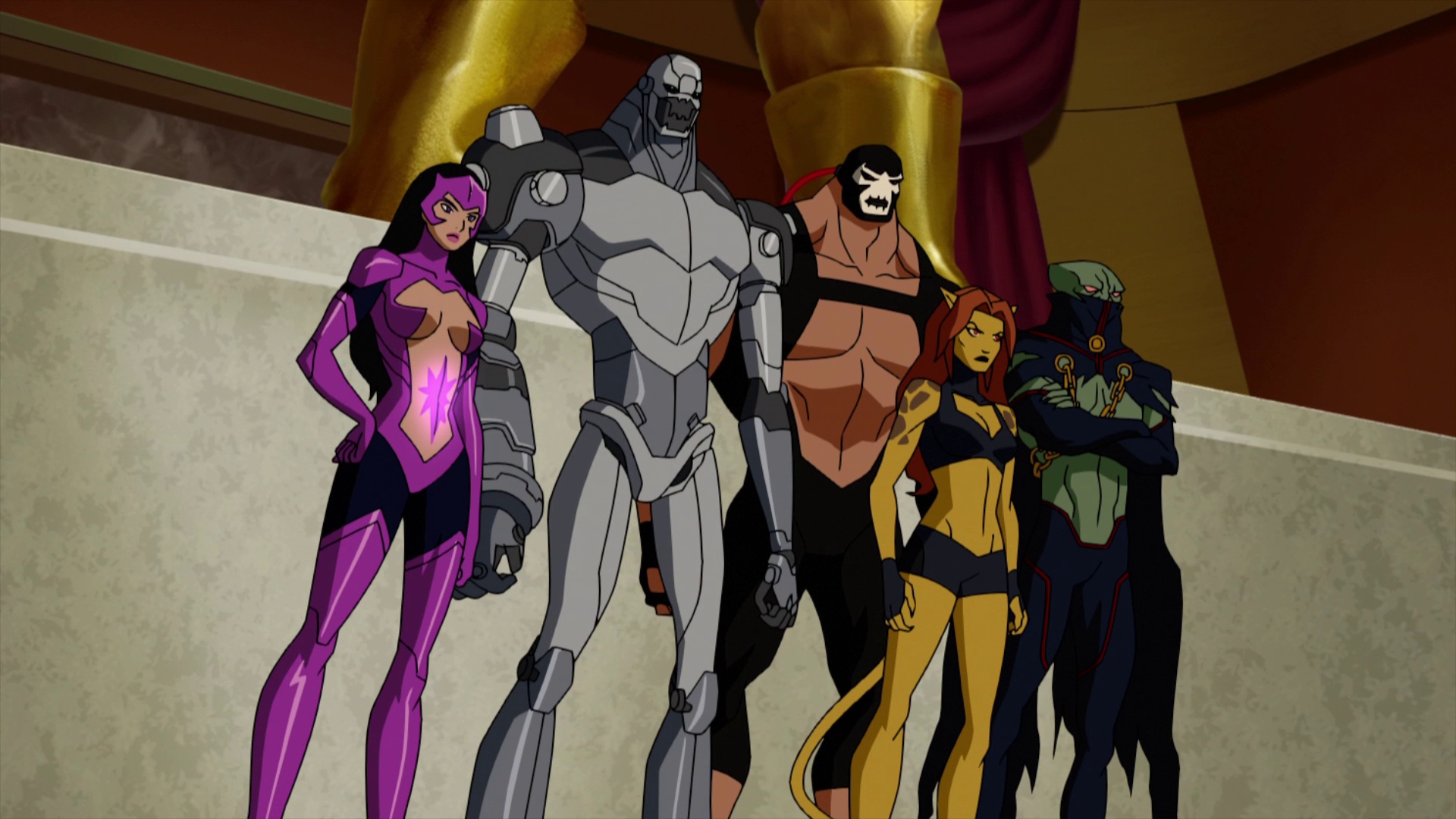 Description: A group of cartoon characters standing in a room together with a giant robot in the background and a man in the foreground.