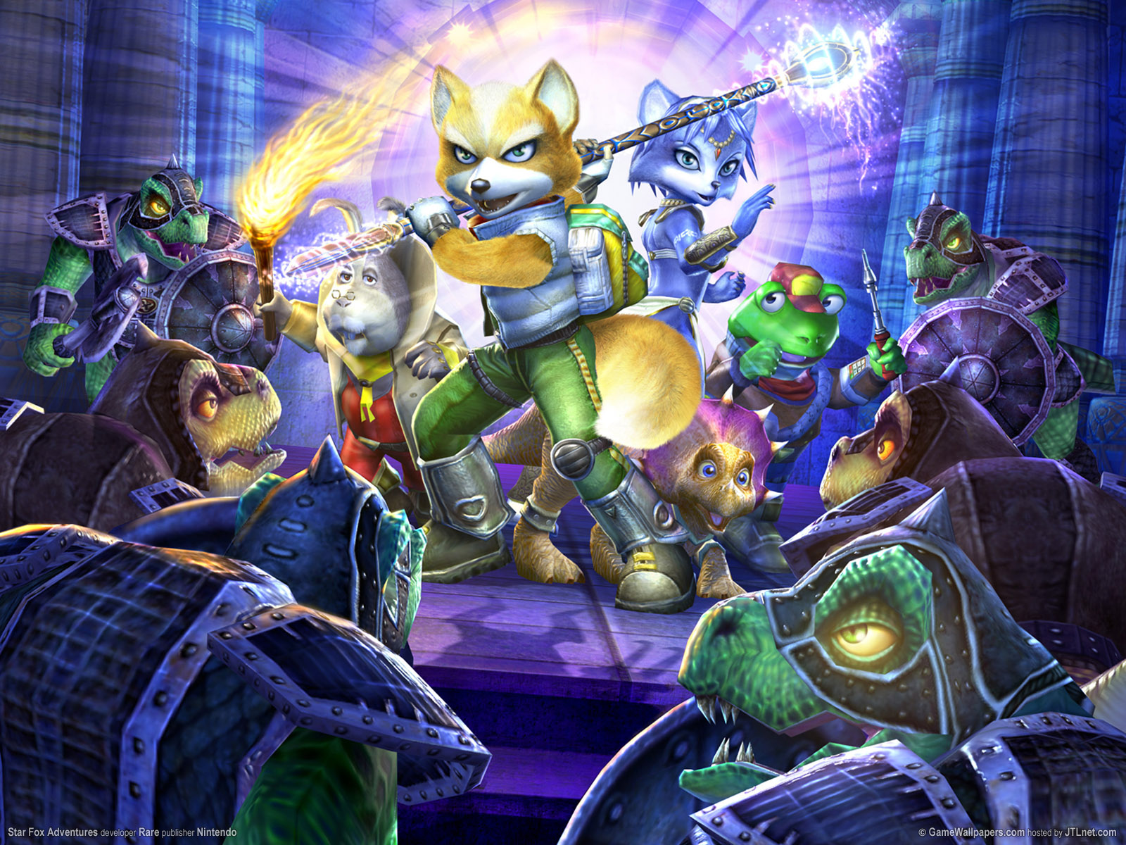 Description: A bunch of cartoon characters standing around each other in a room with a purple light behind them and a cat on the floor.