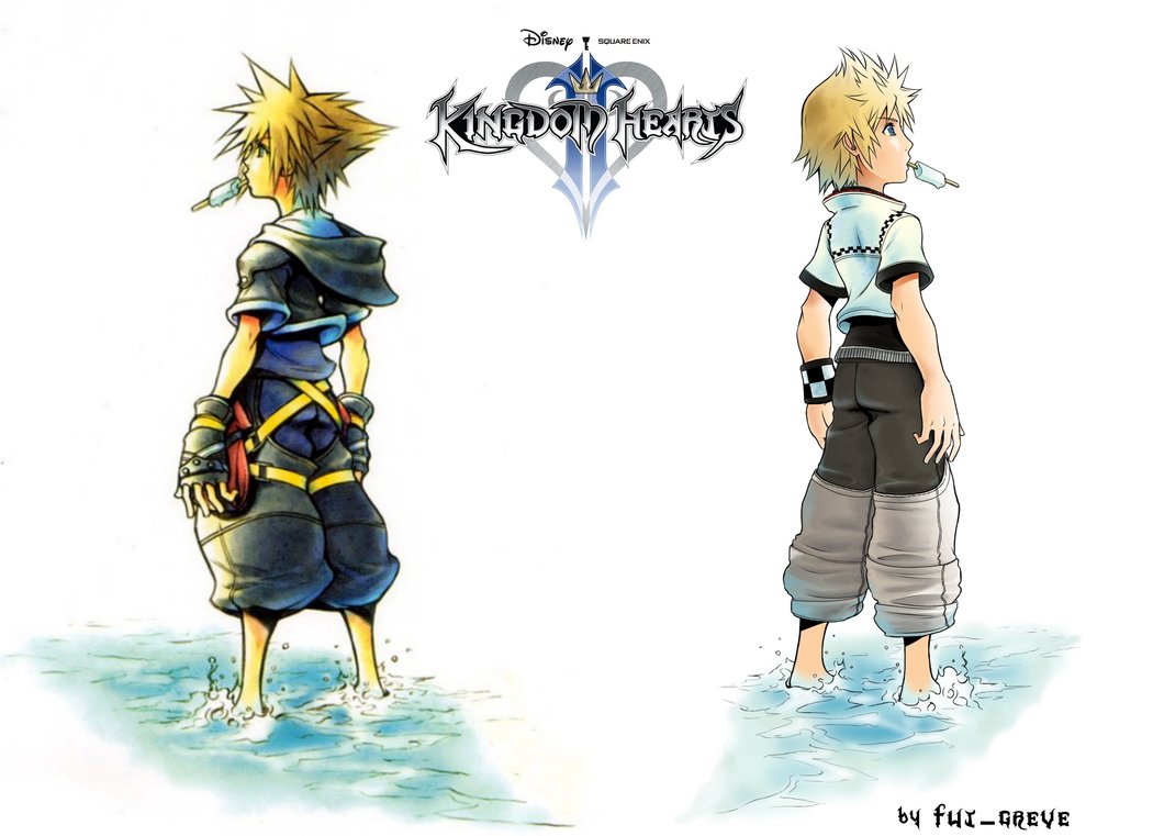 Description: A couple of cartoon characters standing next to each other in the water with their backs turned to the camera.