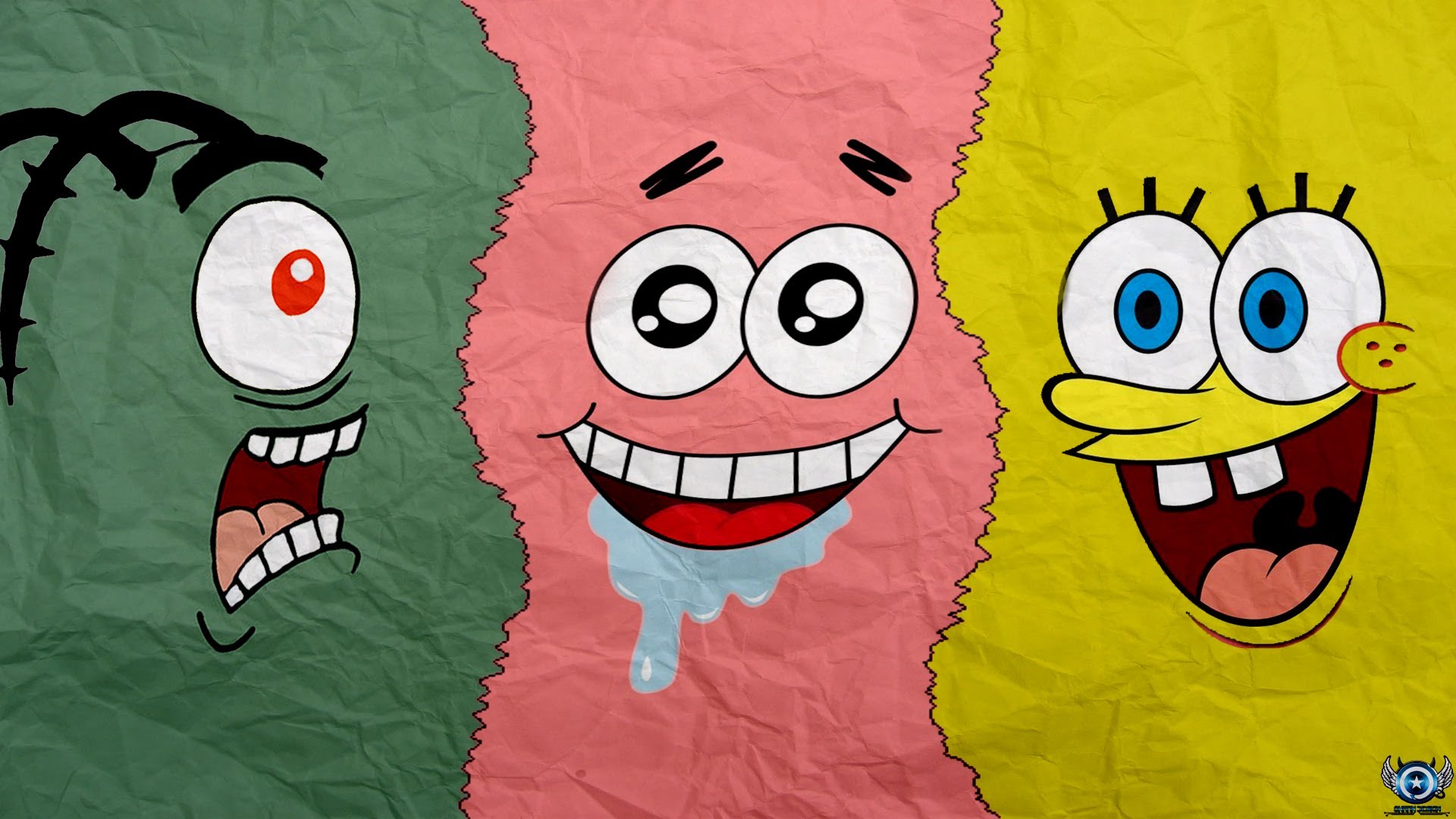 Description: Three cartoon characters are depicted on a piece of paper with a torn background of them and the words.