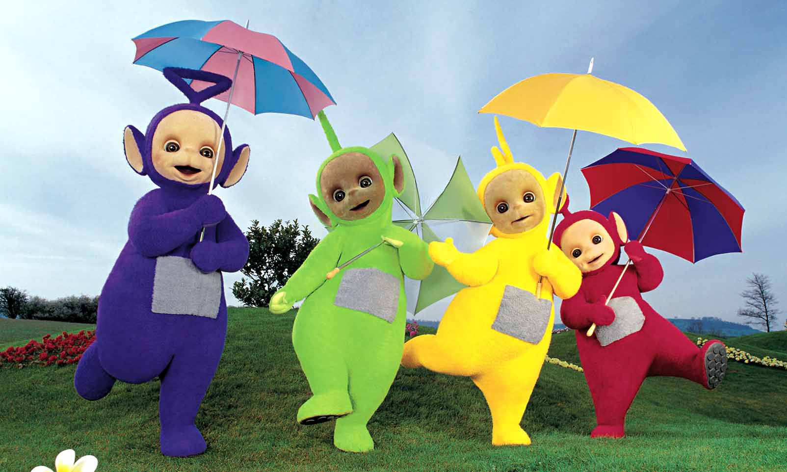 Description: A group of three cartoon characters holding umbrellas in a field of grass with flowers in the background and a blue sky.