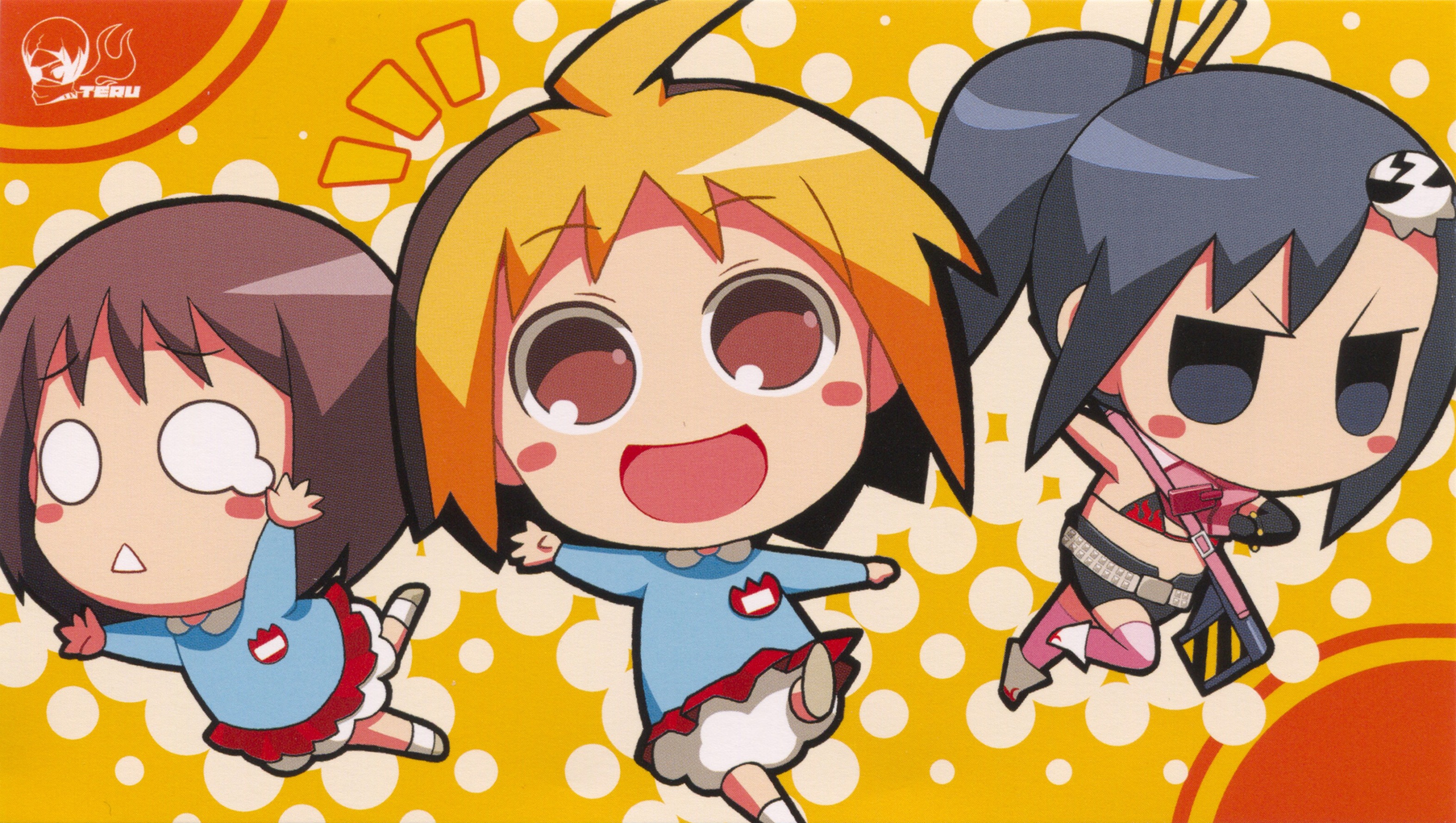 Description: Three cartoon characters are standing in front of a yellow background with bubbles and bubbles around them.