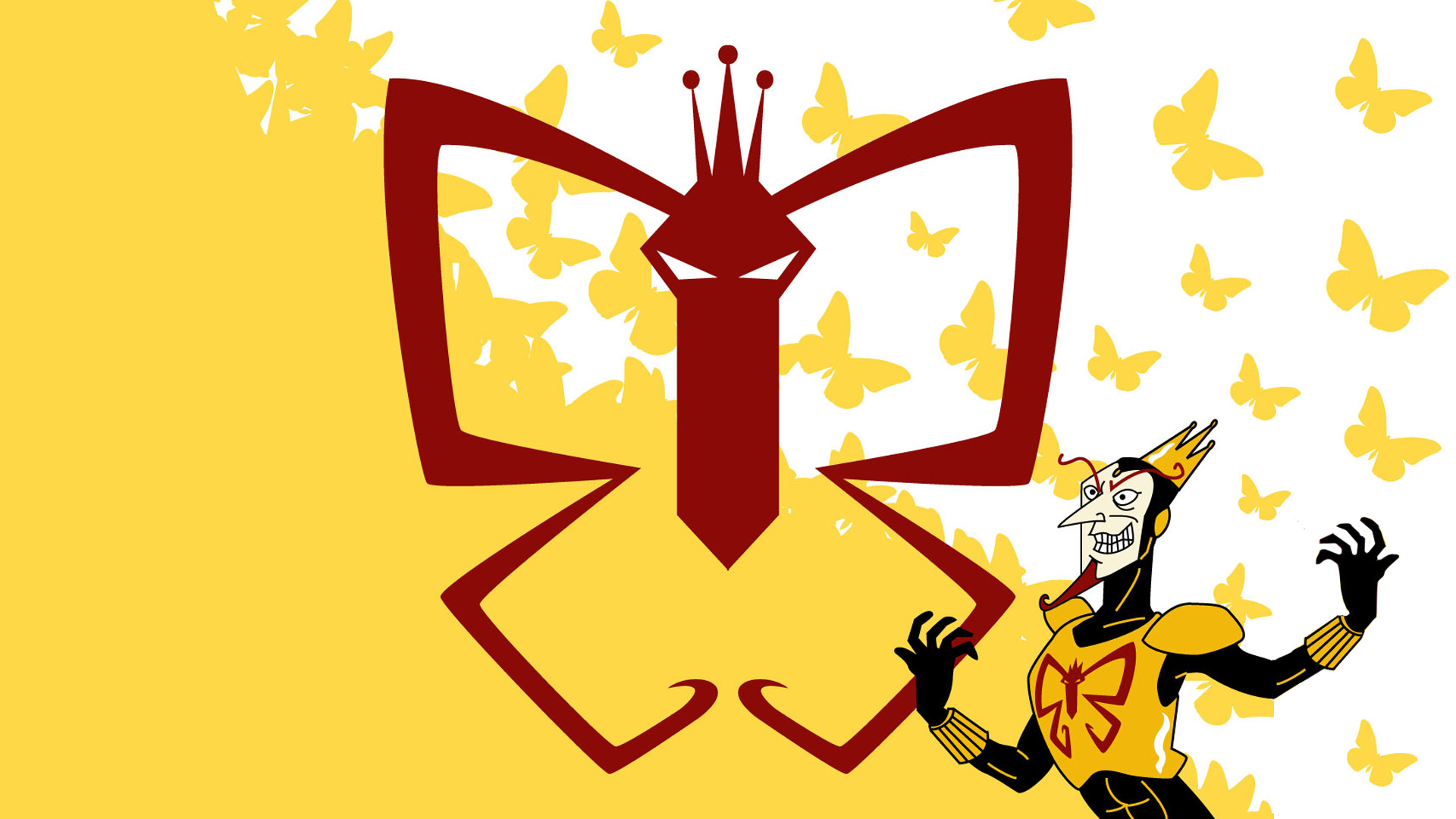 Description: A cartoon character with a crown on his head and a yellow background with butterflies around him and a red and yellow design.