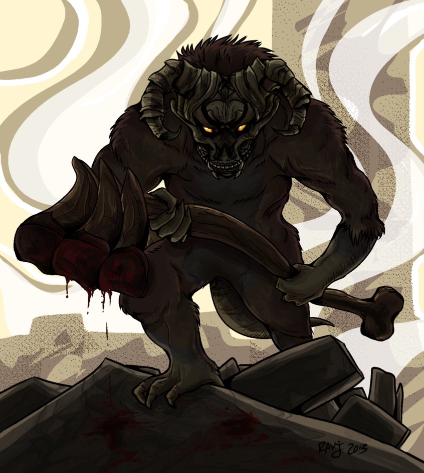 Description: A cartoon of a demon with a hammer in his hand and blood dripping from his mouth and arm.