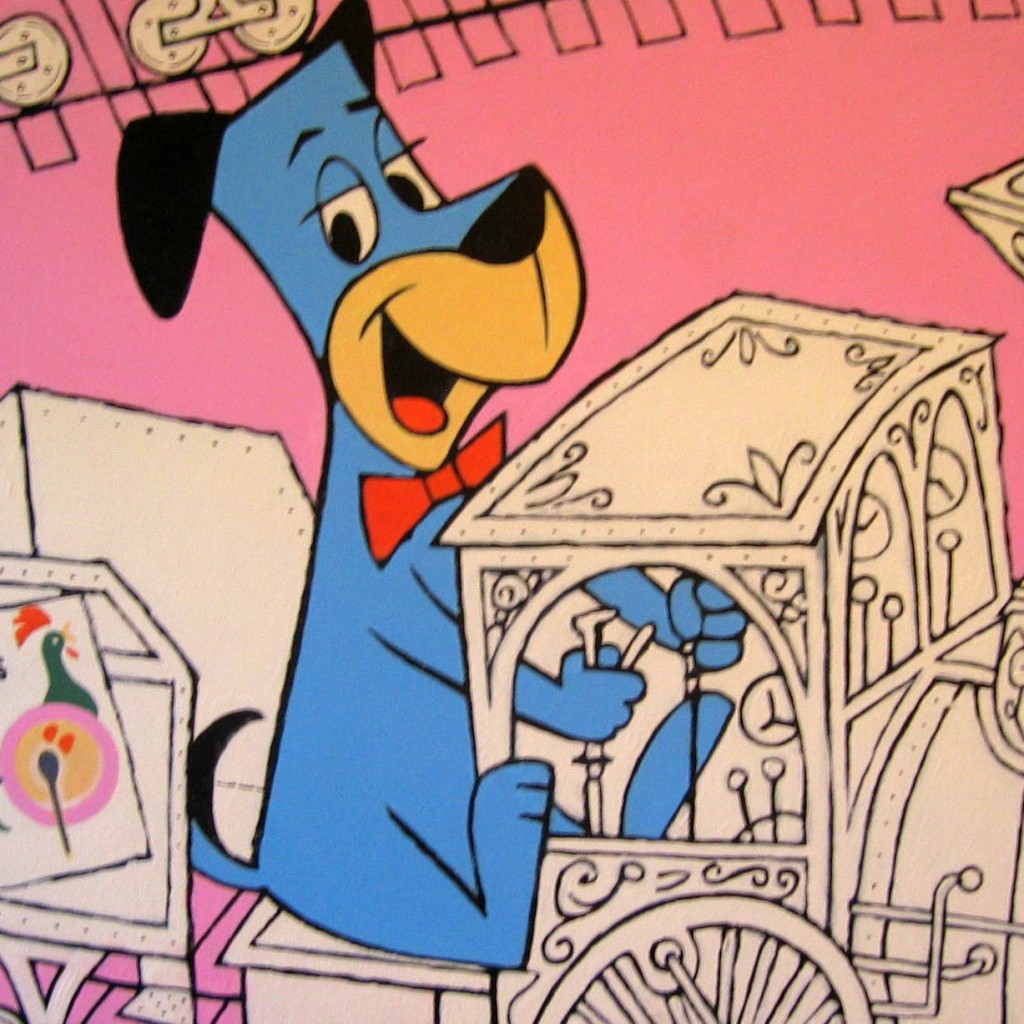 Description: A cartoon dog is driving a cart with a dog in it and a dog in a bow tie is standing next to a cart.