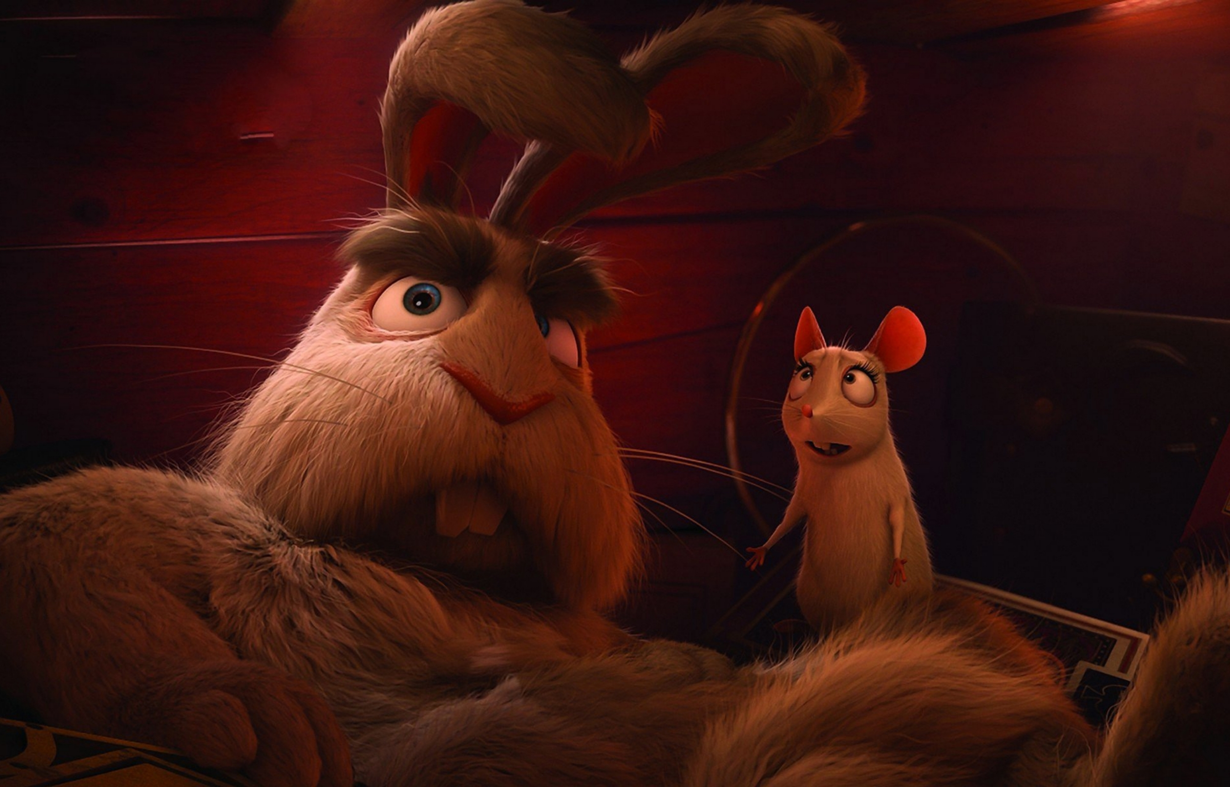 Description: A cartoon character and a dog are sitting together in a room with a red light on the wall and a red light on the ceiling.