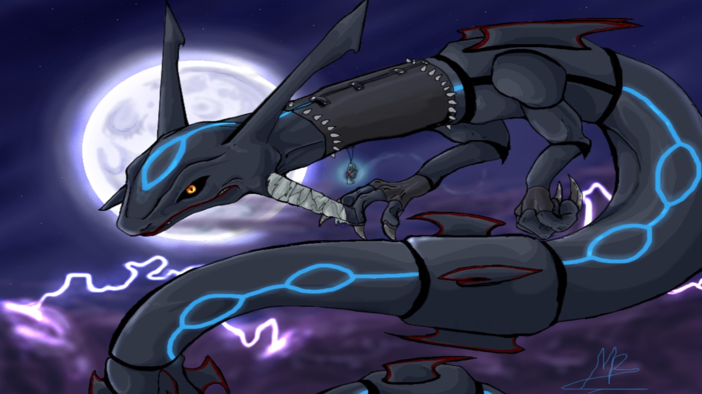 Description: A cartoon of a dragon with a sword in its mouth and lightning in the background.