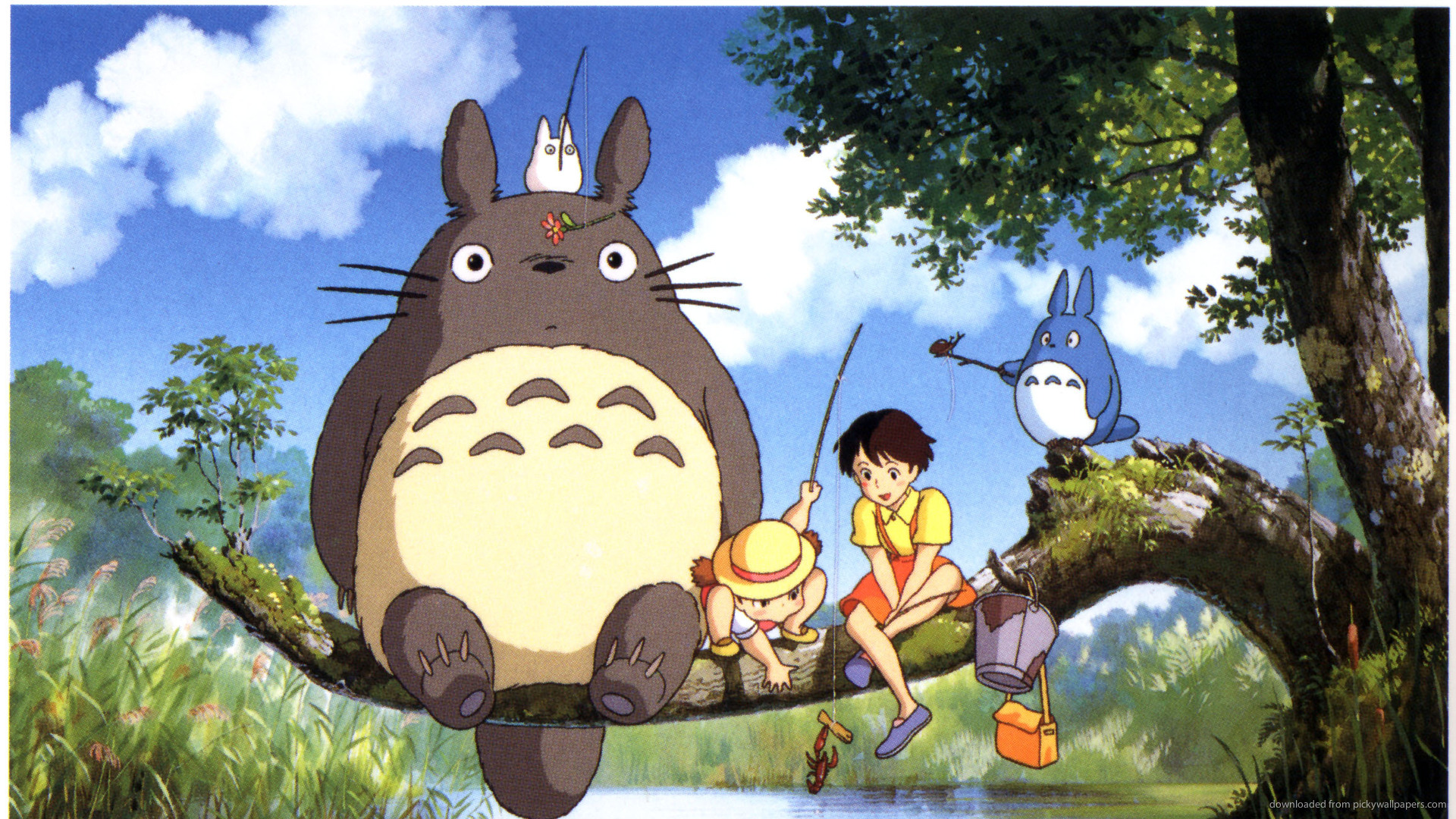 Description: A cartoon of a family sitting on a tree branch with a totoro and a bird in the background.