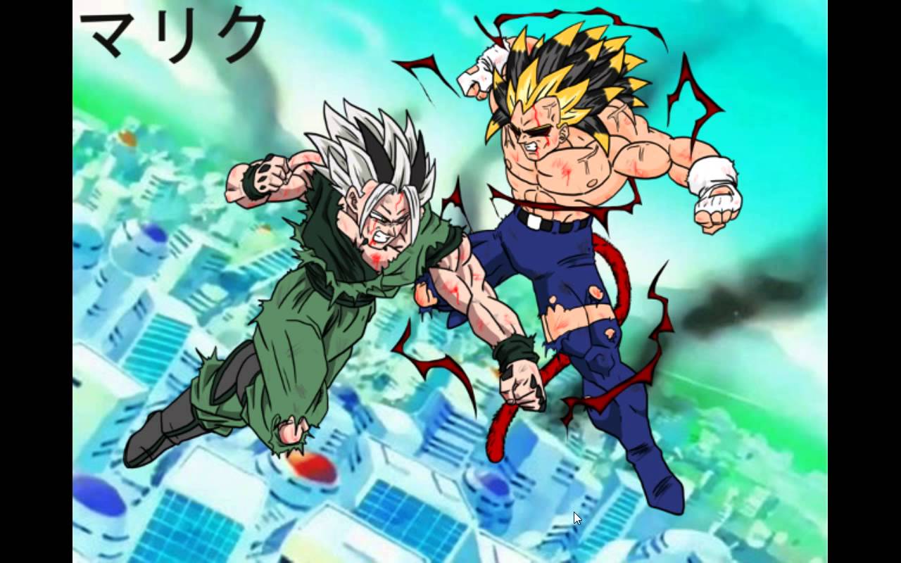 Description: A cartoon of two people fighting each other in the air with buildings in the background and a sky background.