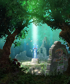 Description: A cartoon scene of a forest with a person standing in the middle of the forest and a light shining through the trees.