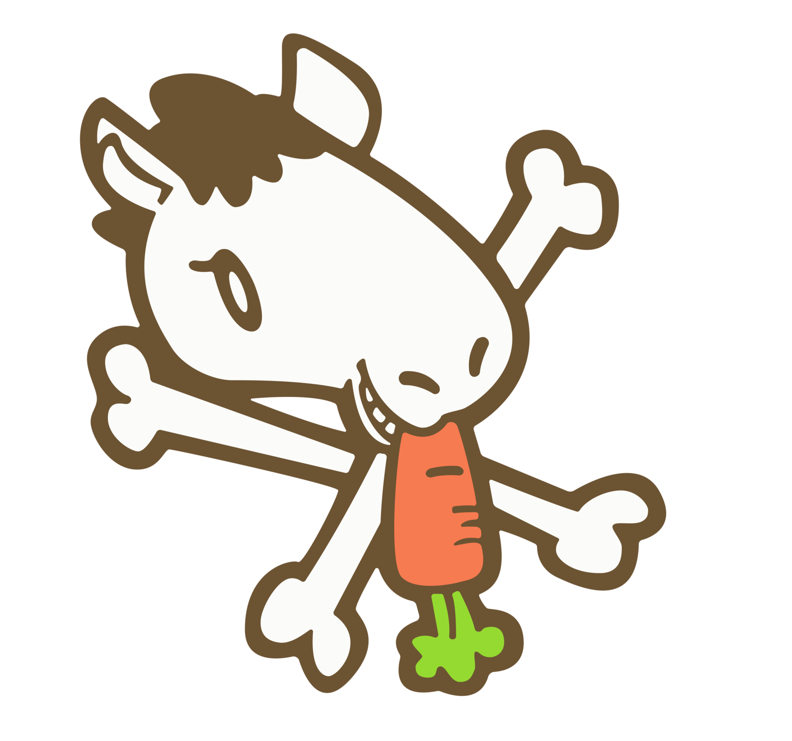Description: A cartoon of a giraffe holding a carrot in its mouth with a bone in the middle of it.