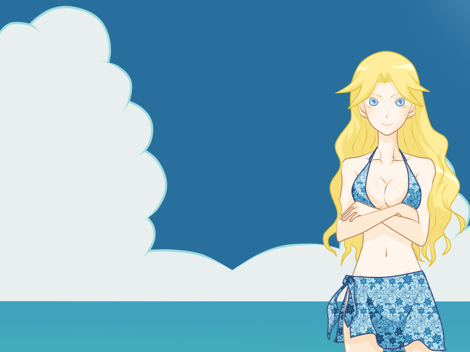 Description: A cartoon girl in a bikini standing on the beach with her arms crossed and her arms crossed behind her back.
