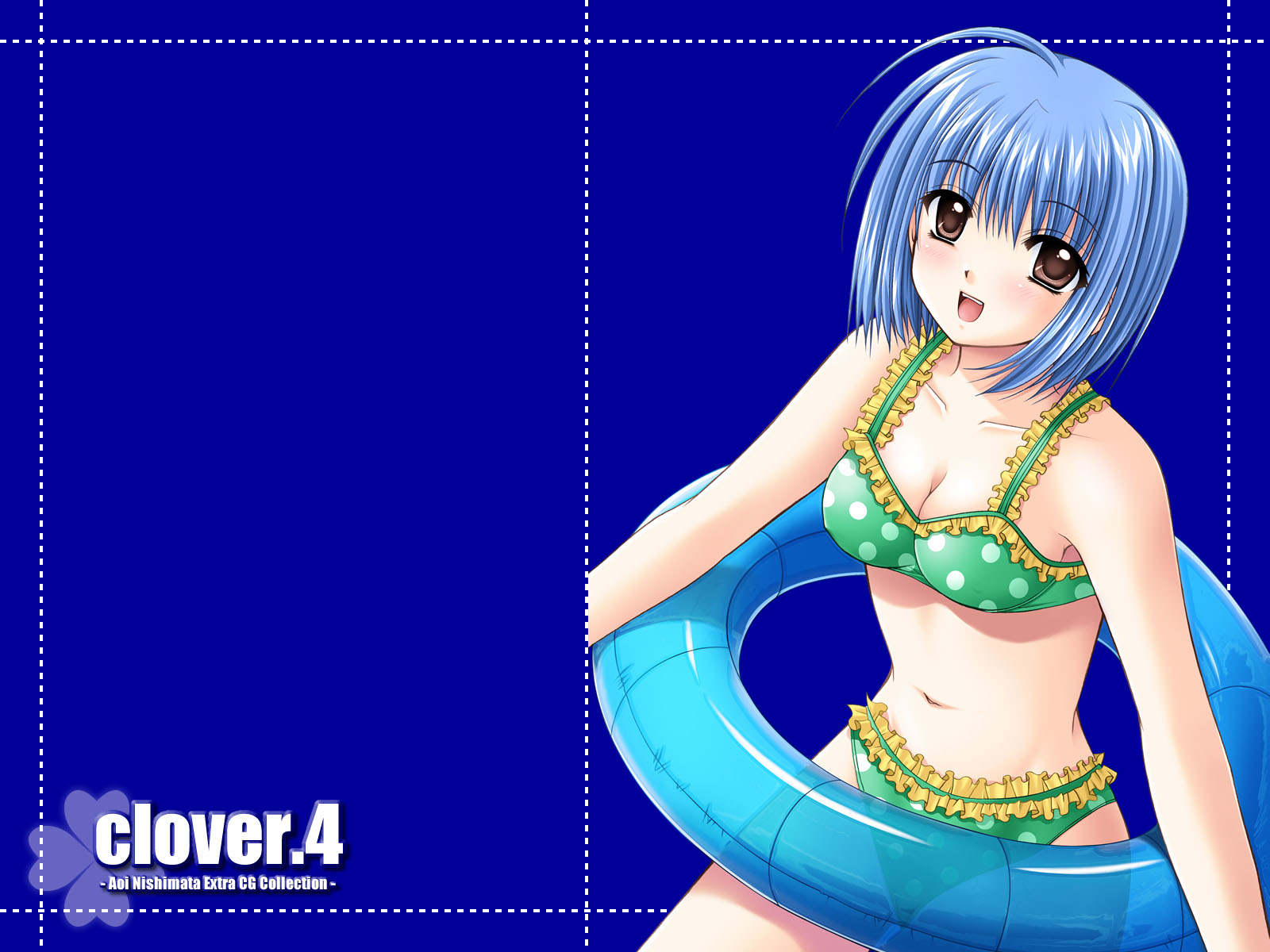 Description: A cartoon girl in a bikini with a ring around her waist and a blue background with a blue rectangle.