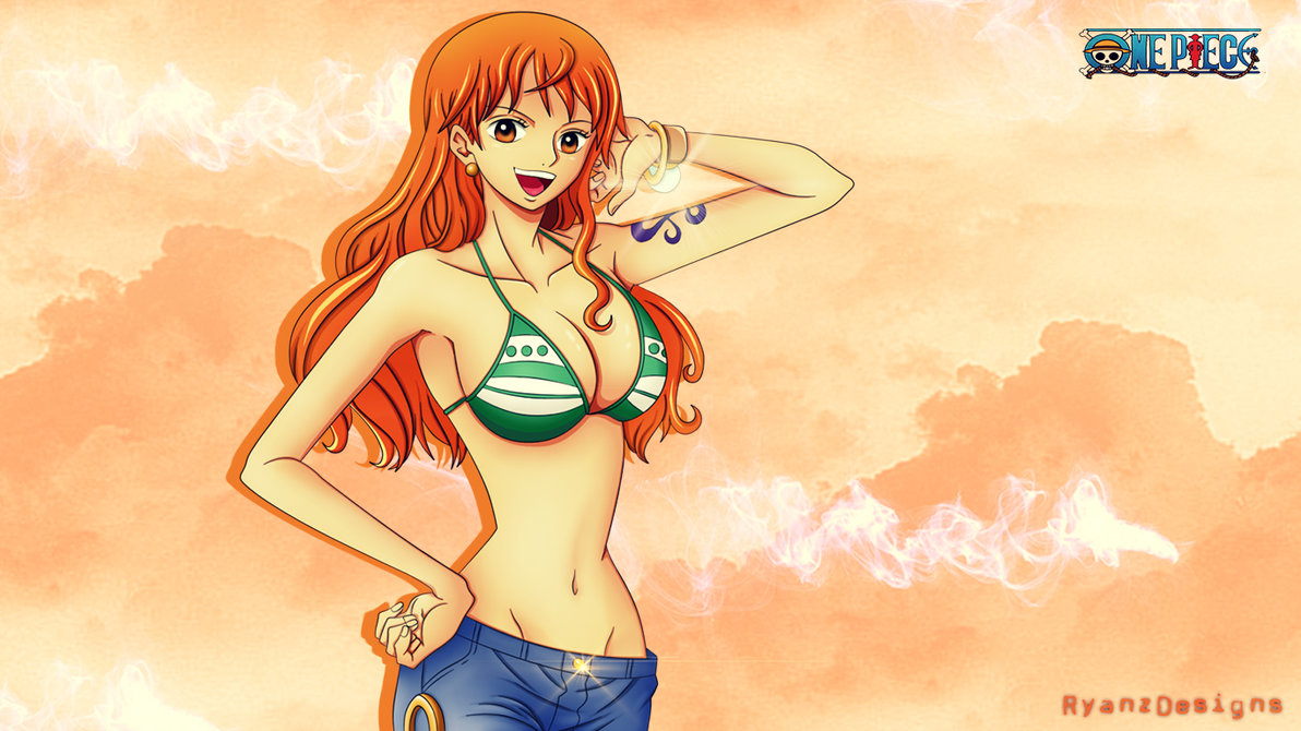 Description: A cartoon girl with a bikini and a umbrella in her hand and a ball in her other hand.