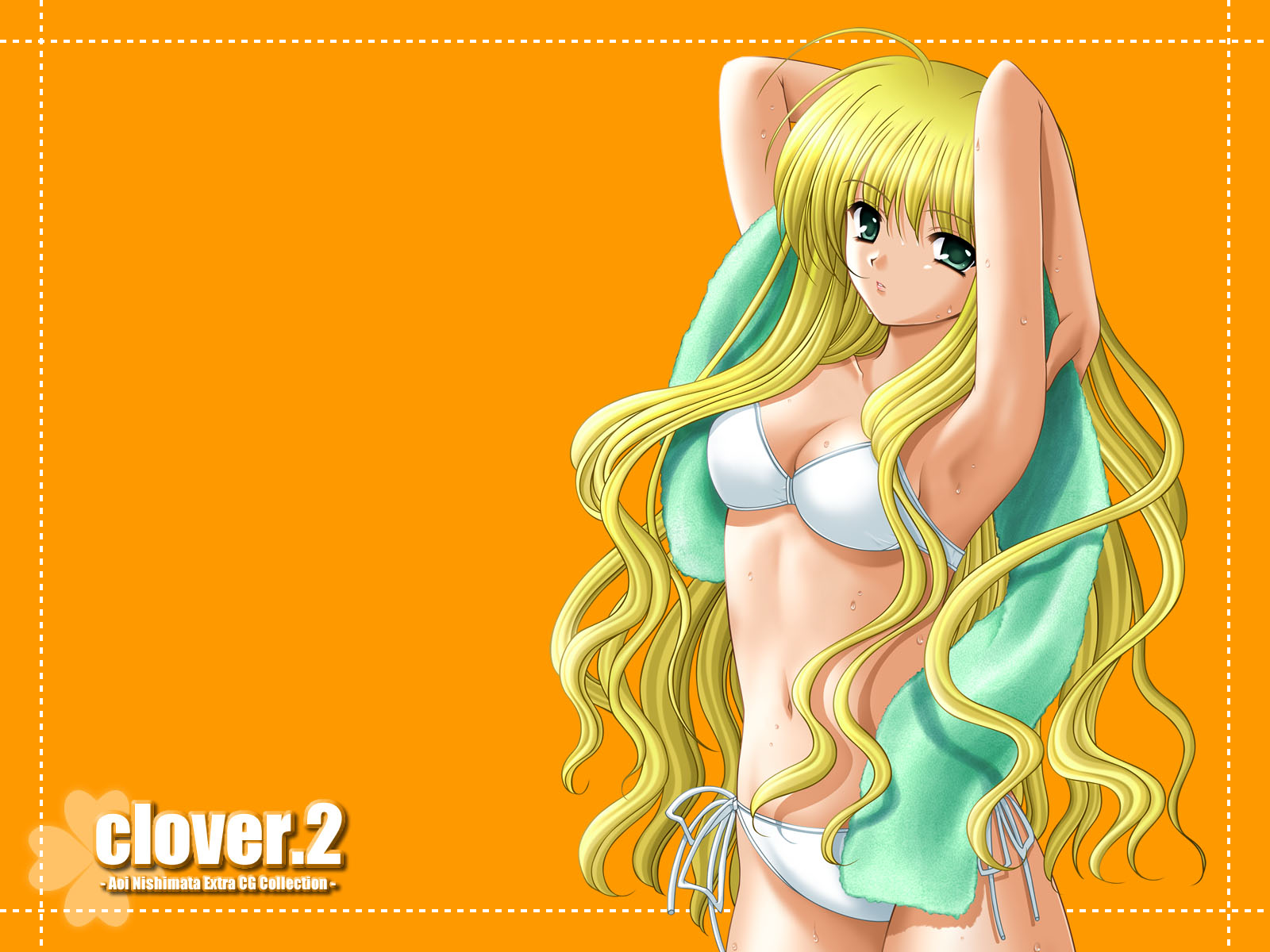 Description: A cartoon girl with long blonde hair and a bikini on a yellow background with a white border around her.