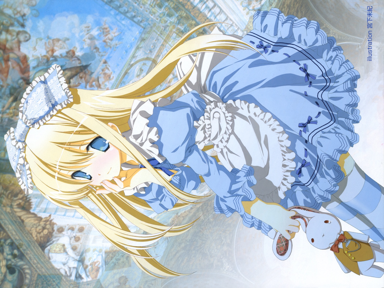 Description: A cartoon girl with long blonde hair and blue eyes wearing a blue dress and holding a white teddy bear.