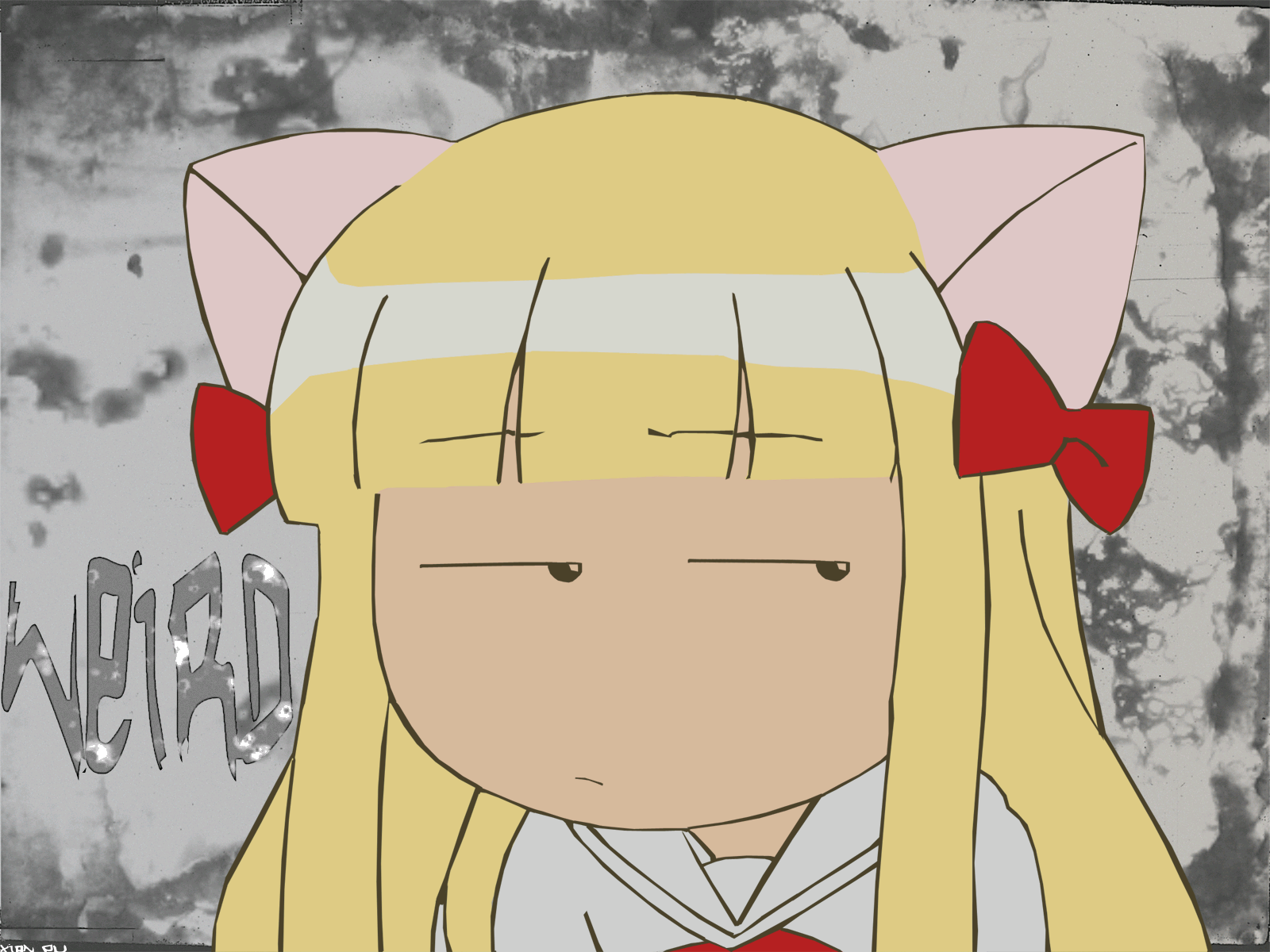 Description: A cartoon girl with blonde hair and a red bow around her head with a grungy background and a grungy wall.