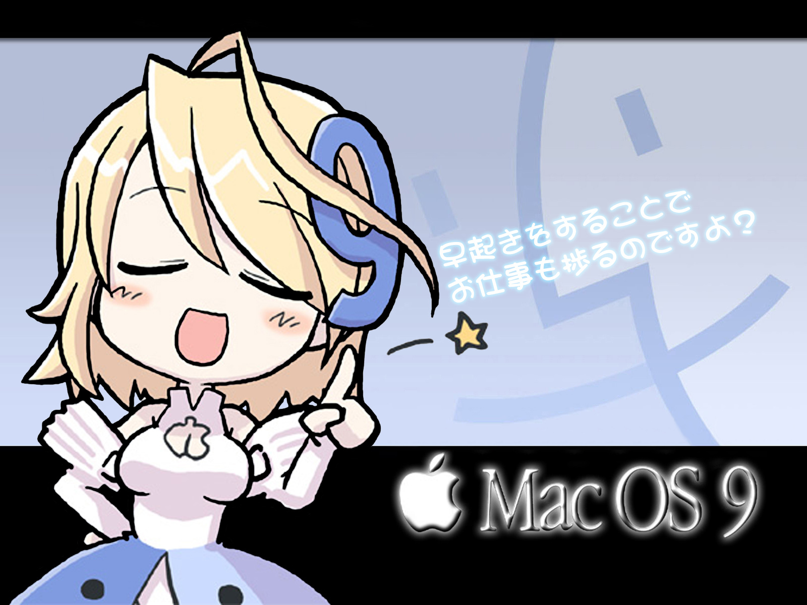 Description: A cartoon girl with a blue dress and a star on her head and a black background with a white text that says macos 9.