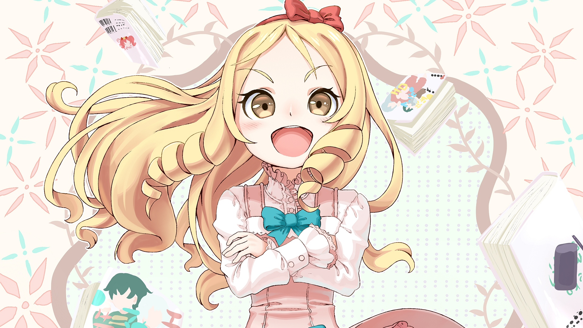 Description: A cartoon girl with a bow on her head and a pink dress on her body.