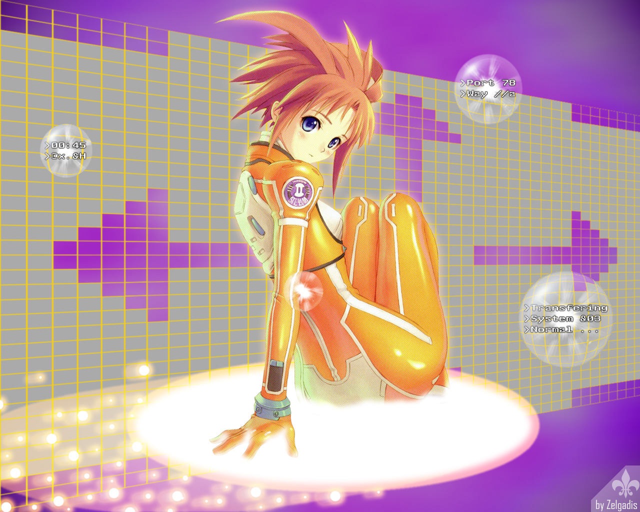 Description: A cartoon character sitting on a floor with a purple background and bubbles around her and a purple background with a yellow and orange background.