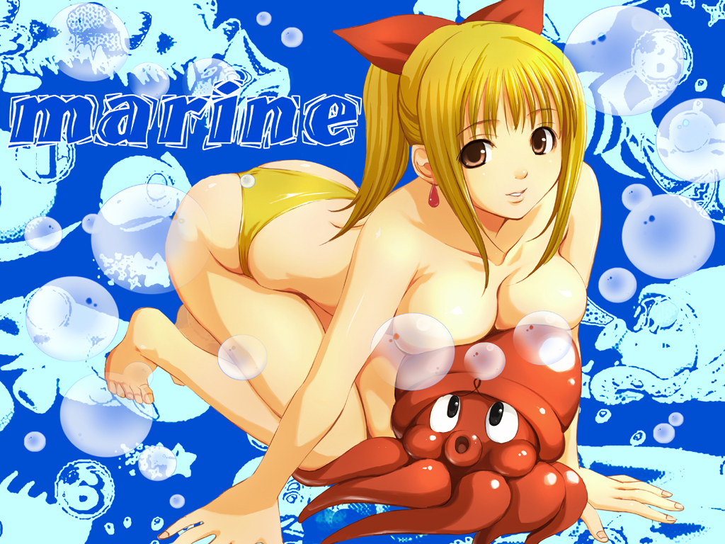 Description: A cartoon picture of a girl with a crab in her hand and a marine theme in the background with bubbles.