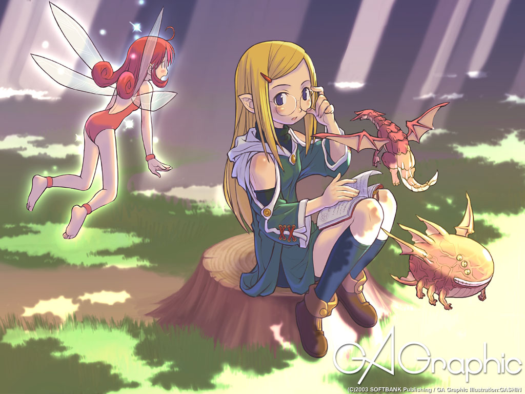 Description: A cartoon of a girl sitting on a rock with a dragon and a girl flying above her and a dragon on the ground.