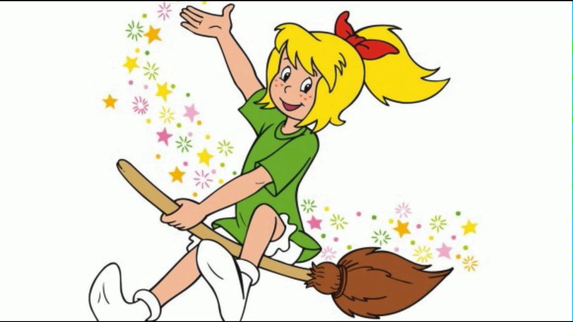 Description: A cartoon girl flying on a broom with stars in the background and a star in the sky above her.