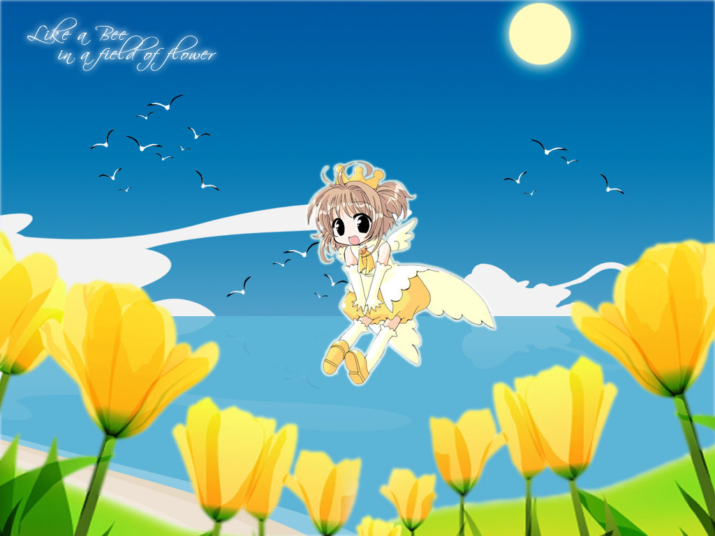 Description: A cartoon girl flying over a field of yellow flowers with a sky background and a sun in the background.
