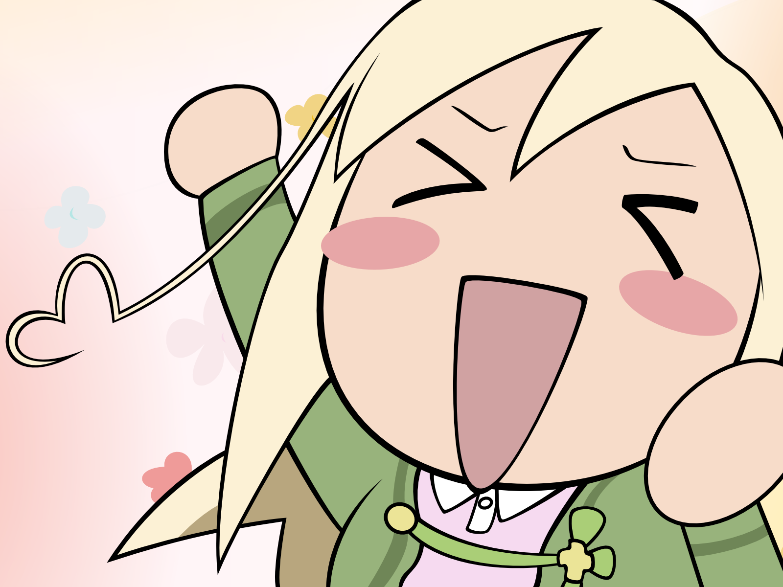 Description: A cartoon girl with a green jacket and a pink background with hearts and a heart - shaped object in the background.
