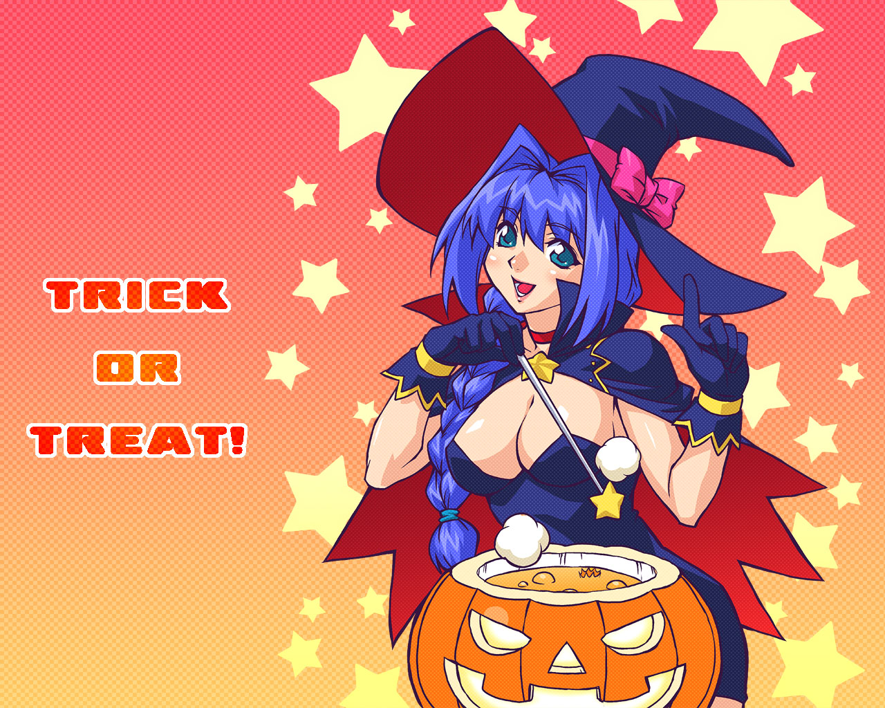 Description: A cartoon character holding a trick or treat pumpkin in her hand and a trick or treat sign in the other hand.