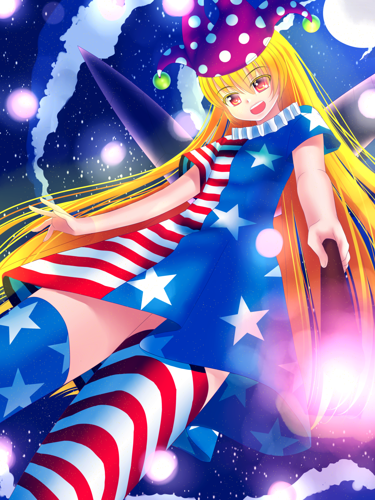 Description: A cartoon girl dressed in a patriotic outfit and stars and stripes is flying through the air with a star spangled hat on.