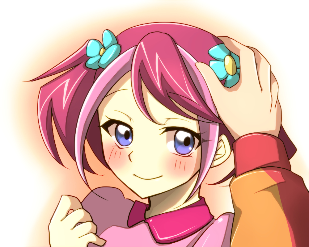 Description: A cartoon girl with pink hair and a pink scarf around her neck and a pink shirt on her chest.