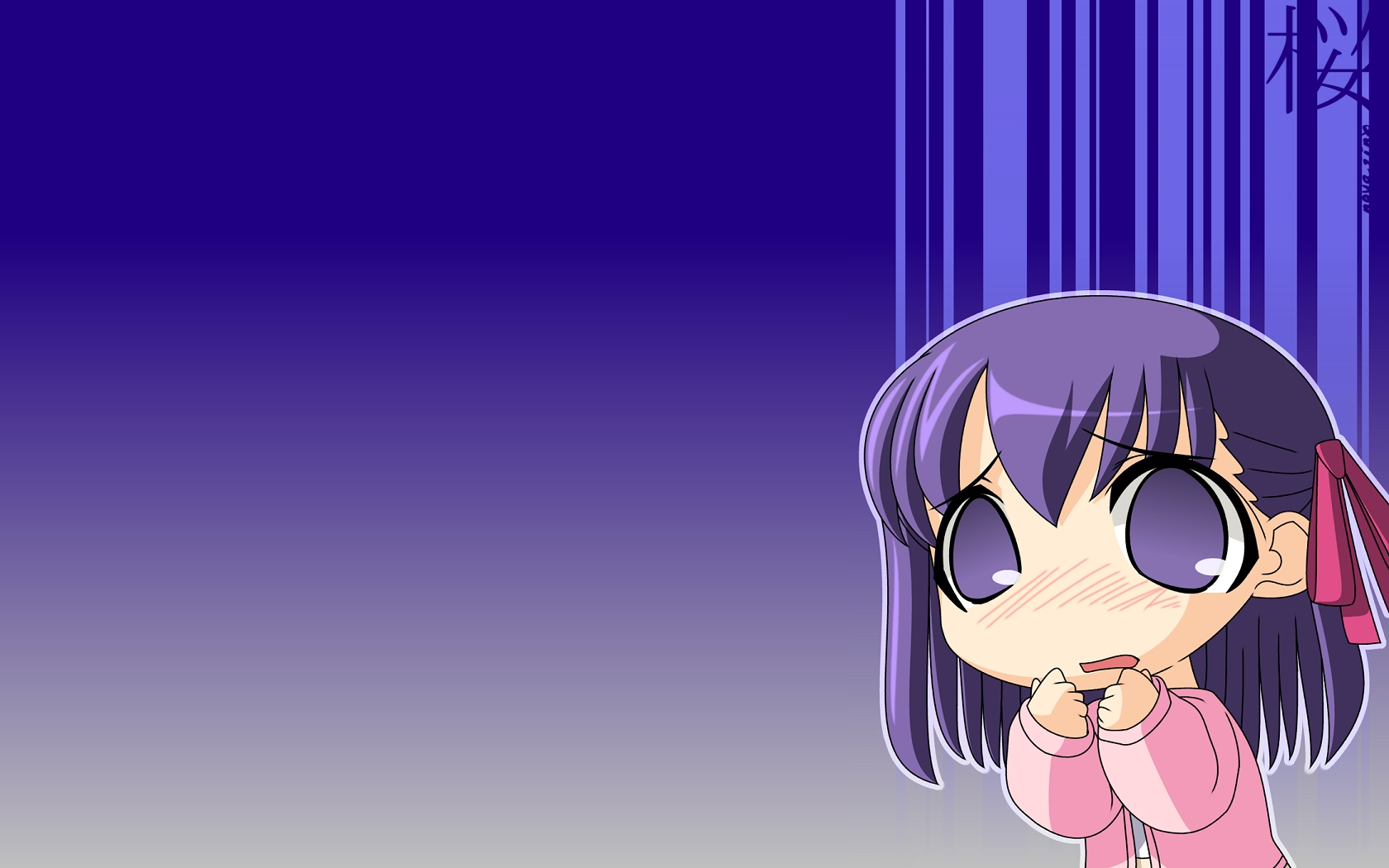 Description: A cartoon girl with a pink shirt and purple hair holding a red umbrella and looking at the camera with a purple background.