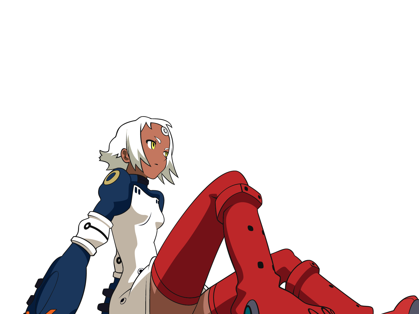 Description: A cartoon character laying on the ground with a red object in her hand and a white background behind her.