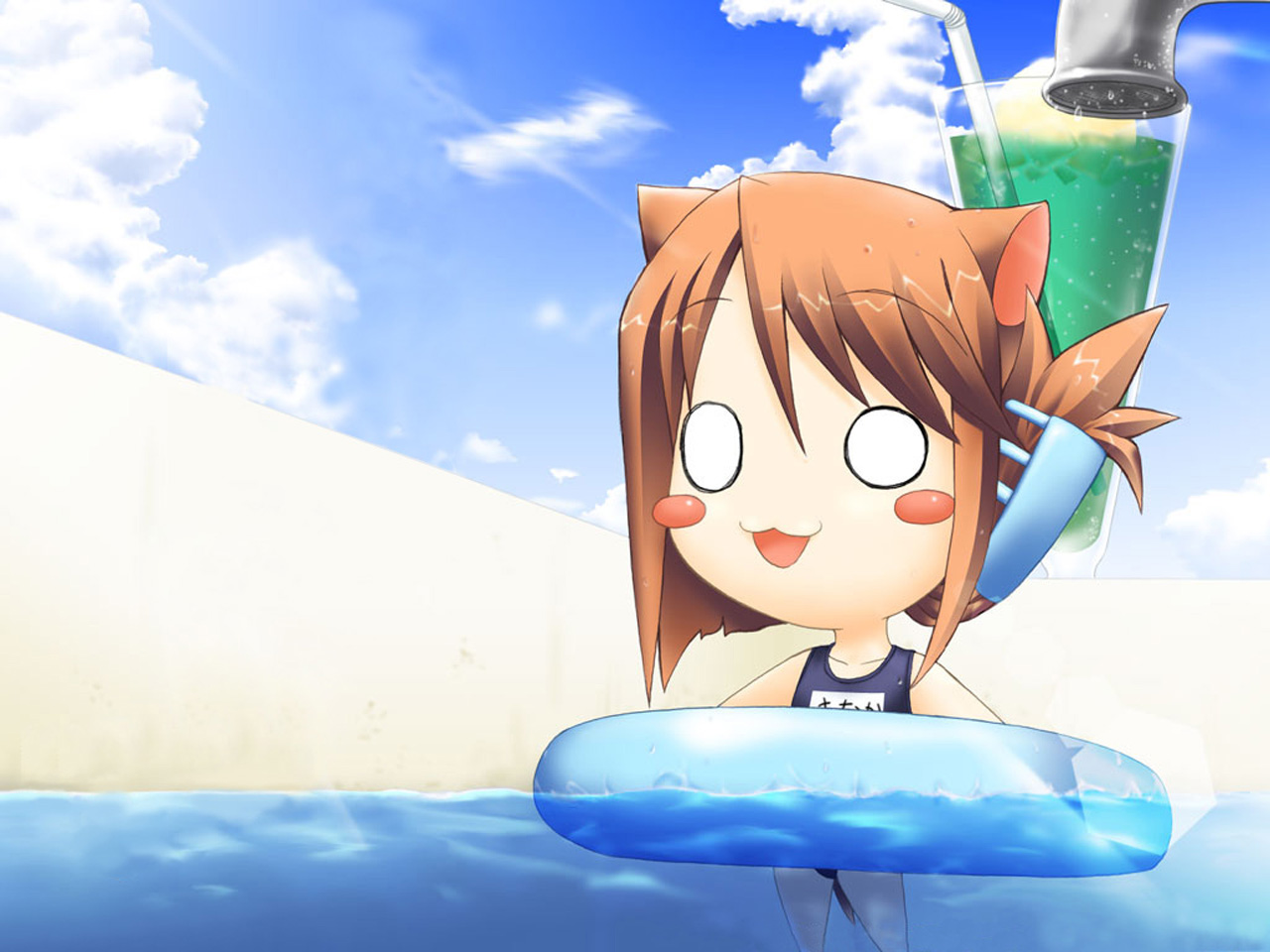 Description: A cartoon girl holding a surfboard in the water with a drink in her hand and a straw in her hand.