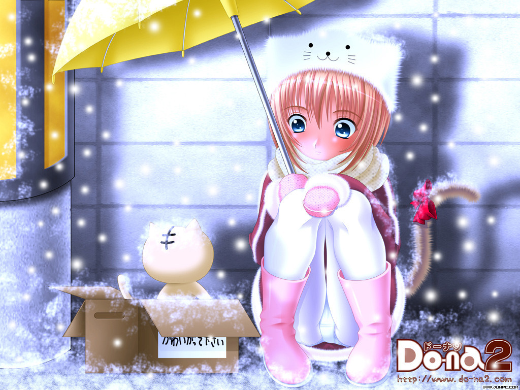 Description: A cartoon girl holding an umbrella in the snow with a cat nearby on a snowy day with snow falling.