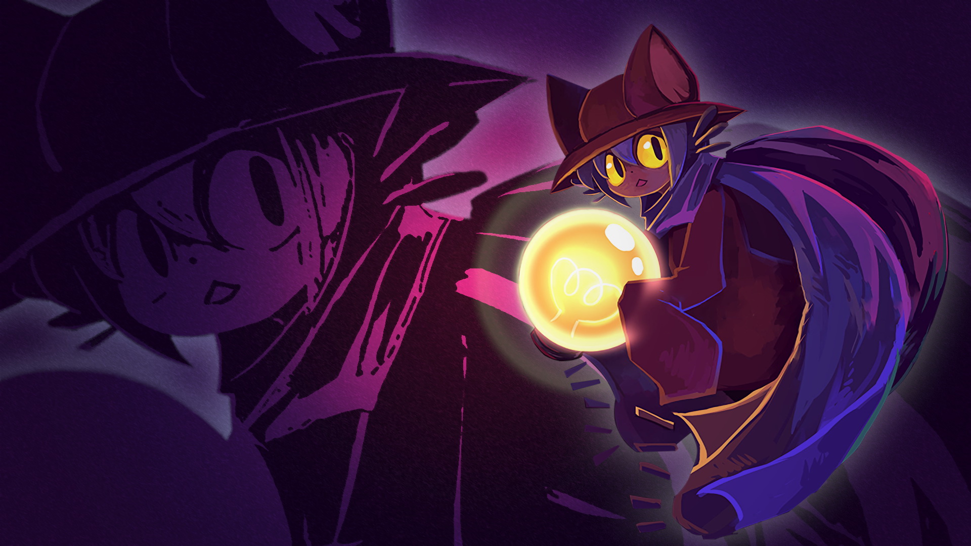 Description: A cartoon character holding a glowing ball in his hand and a cat in the background with a hat on.