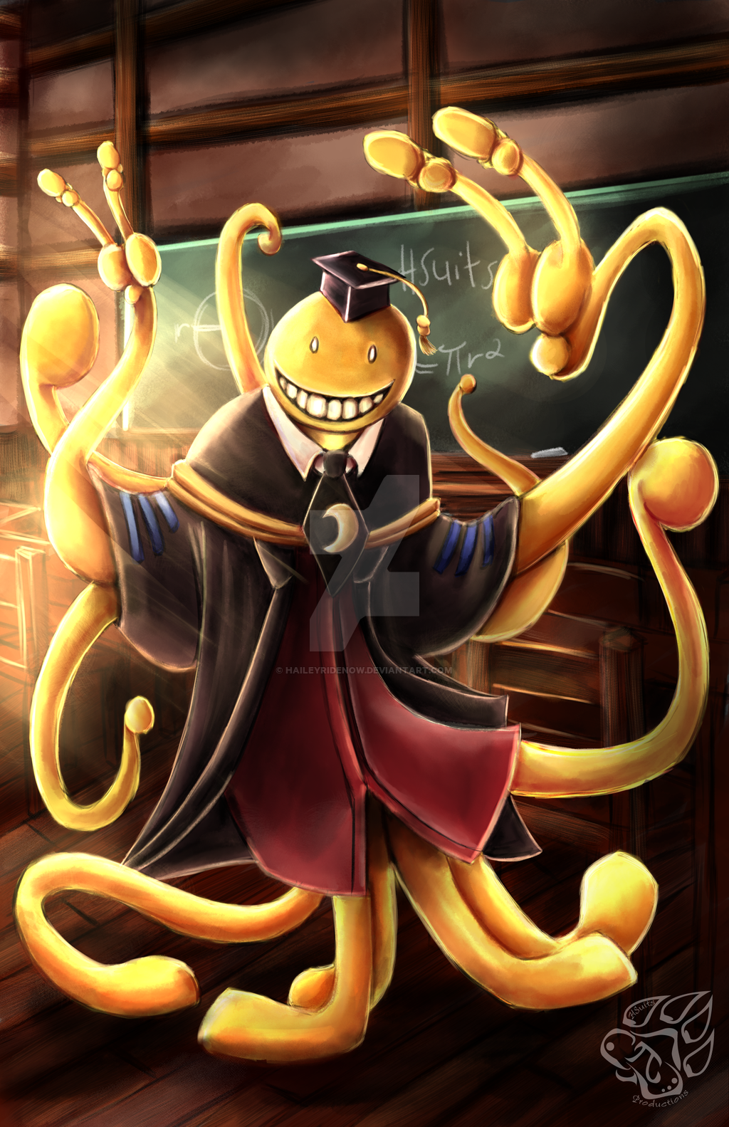 Description: A cartoon character dressed in a graduation outfit and holding a book in his hands with a smile on his face.