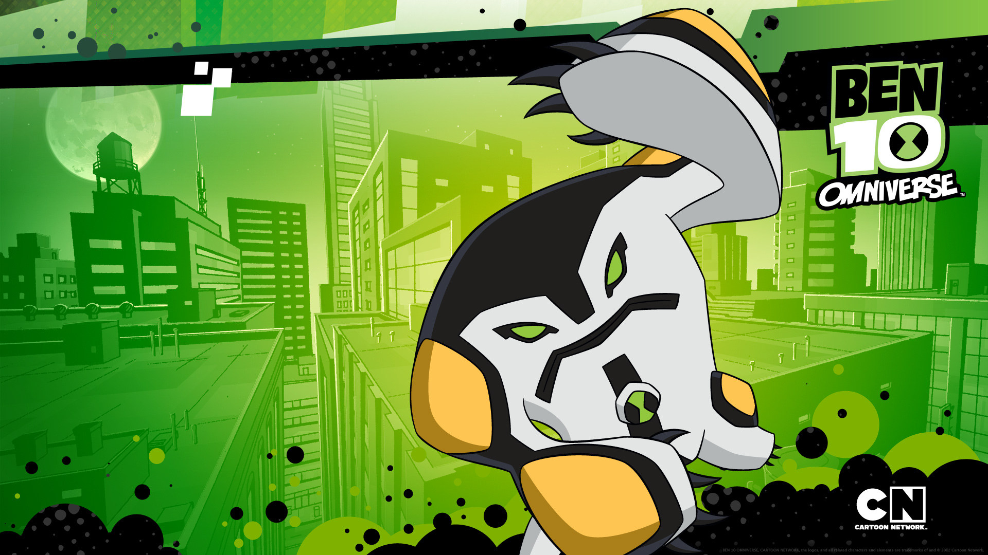 Description: A cartoon character with a green background and a city in the background with buildings and a bird with a yellow beak.